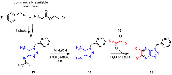 One of the first reported preparations of a 1H-1,2,3-triazolo[4,5-b]pyrazine came from Lovelette and coworkers [16], who utilized condensation of a 4,5-diamino-1,2,3-triazole, 14, and a 1,2-dicarbonyl compound 15 (Scheme 1) to give the desired triazolopyrazines 16 in yields in the range 30–35%. A useful precursor, 4,5-diamino-1,2,3-1H-triazole 14, was prepared by reacting carbamate 13 with a strong base. This carbamate was readily prepared from the carbonyl azide by refluxing in ethanol. The carbonyl azide can be prepared from benzyl azide 11, ethyl cyanoacetate 12, and sodium ethoxide, all commercially available starting materials.