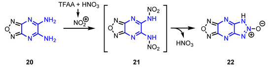 Unexpectedly, Starchenkov and coworkers [18] determined that, upon treatment of diamine 20 with trifluoroacetic anhydride (TFAA) and HNO3 and proceeding via intermediate 21, triazolopyrazine N-oxide 22 was formed (Scheme 3). This was one of the first reports of the preparation of a fused 1,2,3-triazole 2-N-oxide, namely [1,2,5]oxadiazolo[3,4-b][1,2,3]triazolo[4,5-e]pyrazine-6-oxide 22, formed in 92% yield.