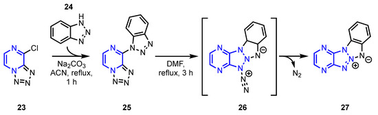 Forming a mesoionic ring system while studying luminescence, Slepukhin and coworkers [19] obtained the 1H-1,2,3-triazolo[4,5-b]pyrazine core within the azapentalene inner salt 27 in 50% yield after intramolecular cyclization of 8-(benzotriazole-1-yl)tetrazolo[1,5-a]pyrazine 25 in refluxing DMF, causing loss of nitrogen via intermediate 26 and formation of 5H-pyrazino[2′,3′:4,5][1,2,3]triazol[1,2-a]benzotriazol-6-ium, inner salt 27 (Scheme 4). Pyrazine 25 was prepared in 48% yield by nucleophilic aromatic substitution of chloride by the benzotriazolyl ion after deprotonation of 1H-1,2,3-benzotriazole 24 by carbonate.