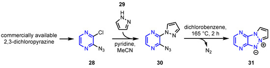 Azapentalenes, containing the 1H-1,2,3-triazolo[4,5-b]pyrazine nucleus, have gained attention for their useful properties, such as in luminescence and complexation [19]. Compounds of this type have demonstrated low toxicity, high solubility, and other properties desirable as potential fluorescence probes [20]. This intramolecular approach has remained popular in obtaining various substituted azapentalenes, another example being that of Nyffenegger and coworkers [21]. Here, the azapentalene, 5H-pyrazolo[1′,2′:1,2][1,2,3]triazolo[4,5-b]pyrazin-6-ium, inner salt, 31, was obtained in yields up to 85% via cyclization with loss of nitrogen after amination of 2-azido-3-chloropyrazine, 28, with either pyrazole 29 or 1,2,4-triazole affording 2-azido-3-(1H-pyrazol-1-yl)pyrazine 30 (Scheme 5). Other derivatives using nitro-substituted pyrazoles were formed in yields in the range 63–97%. This method offers convenience in that a precursor to 28, 2,3-dichloropyrazine, is commercially available.