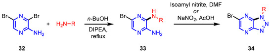 Notably, in addition to having an azido group substituted ortho to the pyrazole of 30 [20,21], reports have also made use of the respective amine via ring closure by displacement of an N-iodonium intermediate by an adjacent nitrogen atom of the attached pyrazole to form azapentalenes [22,23]. Compounds of this type have been thoroughly characterized via NMR spectroscopy [24]. A Pfizer patent [25] filed in 2007 detailed the use of either isoamyl nitrite in DMF or NaNO2 in aqueous acetic acid, after first aminating commercially available 2-amino-3,5-dibromopyrazine 32 in the presence of a sterically hindered base, N,N-diisopropylethylamine (DIPEA), then treating diaminopyrazine 33 with nitrite to form 3,5-disubstituted 1H-1,2,3-triazolo[4,5-b]pyrazine 34 (Scheme 6).