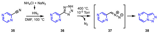 The first method of synthesizing a 1,2,3-triazolo[1,5-a]pyrazine by Wentrup [34] was, at the time, the synthesis of a novel purine isomer. Wentrup utilized the thermolysis of 5-(2-pyrazinyl)tetrazole 36 (400 °C, 10−5 Torr), affording 38, 1,2,3-triazolo[1,5-a]pyrazine in 20% yield proceeding via diazo intermediate 37. The precursor 2-(2H-tetrazol-5-yl)pyrazine 36 was readily prepared from 2-cyanopyrazine, 35, upon treatment with hydrazoic acid generated in situ from ammonium chloride and sodium azide (Scheme 7). This method, while suffering from harsh reaction conditions and poor yields, was the first utilizing intramolecular cyclization of diazo intermediates in the formation of 1,2,3-triazolo[1,5-a]pyrazines. Lead tetraacetate oxidation of the hydrazone of pyrazine-2-carbaldehyde similarly gave 38 in 75% yield [35].