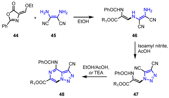 Reaction of 4-(ethoxymethylene)-2-phenyloxazol-5(4H)-one 44 and diaminomaleonitrile 45 forming an adduct 46, which led to triazole 47 and pyrazine 48. (R1 = alkyl.)