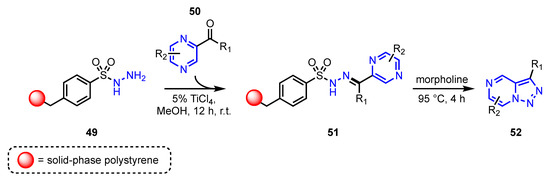 Raghavendra and coworkers [42] reported a triazolopyrazine synthesis employing solid-phase polystyrene p-toluenesulfonyl hydrazide, a common carbonyl scavenging resin. After reaction of the polystyrene p-toluenesulfonyl hydrazide 49 with an acetylpyrazine 50 in the presence of 5% TiCl4 in MeOH, hydrazone 51 was obtained. Reaction of 51 with morpholine gave the desired 1,2,3-triazolo[1,5-a]pyrazines, 52 (Scheme 11), in yields ranging from 33–62%. This regiospecific, traceless protocol represented the first solid-phase assisted synthesis of a triazolopyrazine and was also used for the synthesis of several non-fused 1,2,3-triazoles in the same report in yields up to 60%.