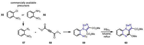 One of the first reported preparations of a 1,2,3-triazolo[1,5-a]pyrazine by Kauer and coworkers [45] started with dimethyl l-(o-nitrophenyl)-lH-triazole-4,5-dicarboxylate 59, and upon treatment with tributyl phosphine in refluxing toluene, afforded methyl 4-methoxy-1,2,3-triazolo[3,4-a]quinoxaline-3-carboxylate 60 (Scheme 13). Triazole 59 was readily prepared from o-azidonitrobenzene 57 (which in turn was prepared from o-chloronitrobenzene 55 or o-aminonitrobenzene 56) and dimethyl acetylenedicarboxylate 58 in CHCl3.