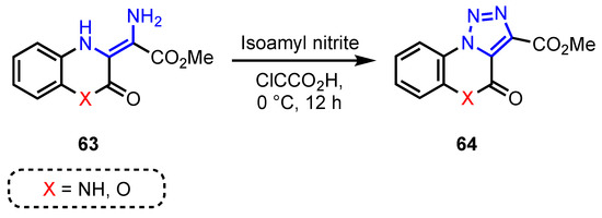 For the intramolecular cyclization of ortho-substituted amines to prepare 1,2,3-triazoles using nitrite, as is commonly reported for non-fused derivatives [2,25], Ager and coworkers [47] illustrated that the amines used in cyclization do not need to be primary. Through reaction of a secondary amine within a ring and a primary amine 63 with isoamyl nitrite in chloroacetic acid, they obtained 1,2,3-triazoles fused to both lactones and lactams, 64, in yields in the range 54–76% (Scheme 15). In the case of lactams, 1,2,3-triazoloquinoxalinones were formed.