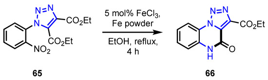 Synthesizing compounds of the same type, Bertelli, and coworkers [48] first formed a triazole diester on a ring ortho to a nitro group, 65, which was intramolecularly cyclized to form ethyl 4,5-dihydro-4-oxo-[1,2,3]triazolo[1,5-a]quinoxaline-3-carboxylate, 66 (Scheme 16). This reaction was conducted by hydrogenation with a 10% Pd/C catalyst or by reaction with FeCl3 and Fe powder. Biagi and coworkers [49] cyclized the triazole diester into 1,2,3-triazoloquinoxalinone 66 with 10% Pd/C in ethanol in an excellent 98% yield. Shen and coworkers further modified the ester group of 66 to prepare a derivative suitable for biological testing [50].