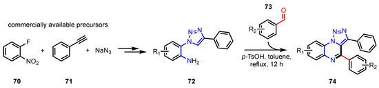 Saha and coworkers [52] used the intramolecular cyclization of ortho-substituted anilines with tethered 1,2,3-triazoles, 72, a Pictet–Spengler reaction, to form 1,2,3-triazoloquinoxalines 73 in yields in the range 61–70% (Scheme 18). This sequence offers two-point diversity: one from 72, and the other from an aryl aldehyde 73. The prerequisite triazole 72 was conveniently prepared from readily available starting materials, including o-fluoronitrobenzene 70, phenylacetylene 71, and sodium azide.