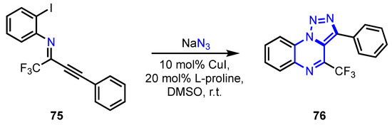 Chen and coworkers [53] used a novel approach for the synthesis of 4-(trifluoromethyl)-1,2,3-triazolo[1,5-a]quinoxaline 76 via cascade reactions of N-(o-haloaryl)alkynylimine 75 with sodium azide in the presence of copper iodide and L-proline (Scheme 19). Among a series of amine-containing catalysts, L-proline resulted in a 98% isolated yield, while tetramethylethylenediamine and N,N′-dimethylethylenediamine gave lower yields, and higher percentages of the uncyclized imine product.