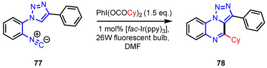 Using photoredox catalysis, He and coworkers [54] used [fac-Ir(ppy)3] as a photocatalyst to afford the corresponding 1,2,3-triazoloquinoxaline 78 from isonitrile 77 in 60% yield (Scheme 20). Due to poor solubility of the catalyst, ACN resulted in decreased yields compared to DMF. This work is a rare example of free-radical generation of 1,2,3-triazole-fused ring systems, as cyclohexyl radicals are proposed to have formed from phenyliodine(III)dicarboxylate. The radicals yield isonitrile carbon radicals, followed by reaction with carbon 5 of the triazole. Various fused rings were synthesized in addition to 1,2,3-triazoles including tetrazoles, pyrazoles, and imidazoles in yields as high as 80%.