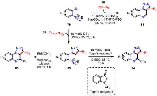 Copper-catalyzed synthesis of 1,2,3-triazolo[1,5-a]quinoxalines 81 from 1-azido-2-isocyanoarenes 79. Annulation of intermediate 83 with 1) Togni’s reagent II and catalytic TBAI forming 84, or 2) phenylboronic acid and a manganese catalyst forming 85. (R1, R2 = alkyl or aryl.)