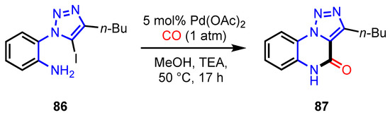 Employing a Pd-catalyzed intramolecular cyclization of triazole 86, Kotovshchikov and coworkers [56] synthesized 3-butyl-[1,2,3]triazolo[1,5-a]quinoxalin-4(5H)-one 87 in 77% yield. As this reaction was conducted under CO (1 atm), the carbonyl carbon of the quinoxalinone was introduced by Pd-catalyzed insertion of CO (Scheme 22).