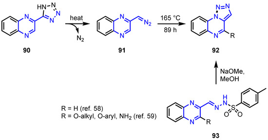 Preparative thermolysis of tetrazoloquinoxaline 90 proceeded by loss of nitrogen through diazo intermediate 91 and then to 1,2,3-triazolo[1,5-a]quinoxaline 92 in 67% yield (Scheme 24) [58]. Using a ring-closure method similar to that used by both Raghavendra and coworkers [42] and Cue and coworkers [46], Vogel and Lippmann [59] developed a route to derivatives of 92 in 47–89% yield via conversion from tosylhydrazones 93 using base (Bamford-Stevens conditions) or, in certain cases, heat (Scheme 24).