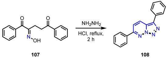 Livi and coworkers [60] reviewed syntheses of this heterocyclic system covering reports prior to 1996. Another review on condensed 1,2,3-triazoles appeared in 2008, which includes synthesis of 1H-1,2,3-triazolo[4,5-d]pyridazines [32]. Here, we summarize both older and newer reports. A common theme in the literature regarding the synthesis of 1H-1,2,3-triazolo[4,5-d]pyridazines is the reaction of 1,2,3-triazole dicarbonyl species with hydrazine hydrate. This yields a diacylhydrazide, which can be cyclized with either high heat or acid. One of the first examples (Scheme 25) is from Fournier and Miller [61], who used 2-(4,5-dibenzoyl-1H-1,2,3-triazol-1-ylmethyl)-3,4,6-trimethylhydroquinone diacetate and hydrazine hydrate in ethanol to form 4,5-diphenyl-1H-1,2,3-triazolo[4,5-d]pyridazine. In a comparable manner, Erichomovitch [62] used triazole diesters 94 to obtain diacylhydrazides 95, which were heated to form 1H-1,2,3-triazolo[4,5-d]pyridazines 96 in 80% yield with loss of hydrazine.