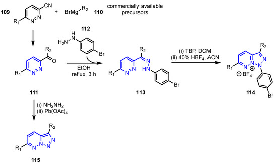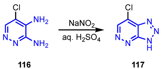 - Ramanaiah, K.V.C.; Stevens, E.D.; Trudell, M.L. Synthesis of 1-substituted [1,2,3]triazolo[4,5-d]pyridazines as precursors for novel tetraazapentalene derivatives. J. Heterocycl. Chem. 2000, 37, 1597–1602. [Google Scholar] [CrossRef]