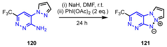 - Daniel, M.; Hiebel, M.A.; Guillaumet, G.; Pasquinet, E.; Suzenet, F. Intramolecular metal-free N−N bond formation with heteroaromatic amines: Mild access to fused-triazapentalene derivatives. Chem. Eur. J. 2020, 26, 1525–1529. [Google Scholar] [CrossRef]