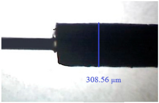 Image of the produced SPME fiber (on the left side, a glass core can be seen) magnified by 50×, and respective diameter.
