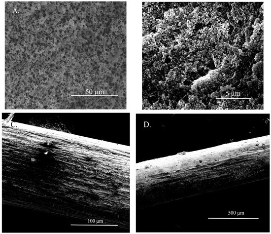 SEM images of the developed SPME fiber in different magnifications (A) 50 µm; (B) 5 µm; (C) 100 µm; (D) 500 µm.