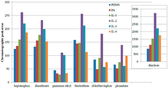 Comparison of the extraction abilities of the investigated insecticides for different ILs, and with reference PA and PDMS commercial fibers, under optimal conditions.