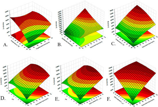 Statistical significance of the effects of the extraction parameters on the extraction performance of the IL-based fiber: (A) response surfaces as functions of extraction temperature vs. equilibration time; (B) response surfaces as functions of equilibration time vs. extraction time; (C) response surfaces as functions of temperature vs. extraction time; (D) response surfaces as functions of pH vs. extraction time; (E) response surfaces as functions of pH vs. salt content; (F) response surfaces as functions of salt content vs. extraction time.