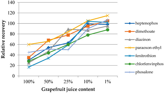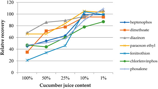 In the case of samples with a complex chemical composition, such as food samples, the presence of other components may influence the target analytes’ extraction process. The matrix effect was assessed on the basis of the change in the extraction efficiency depending on the degree of juice dilution. Four dilutions were used, with the sample juice contents being 50%, 25%, 10%, and 1% by volume. Additionally, extractions from the headspace of fresh juice samples were performed. The experiments were performed under optimized conditions. The determined dependences of the relative recovery for the investigated insecticides as a function of the dilution of the original juice samples are presented in Figure 6 (grapefruit) and Figure 7 (cucumber). The extraction results from water samples were used as the reference point. As can be seen in both cases, the matrix effect was significant, where the reduction of the extraction efficiency ranged from 20 to 60% and from 20 to 70% for grapefruit and cucumber juice, respectively. In the case of cucumber juice with a juice content of 10%, only for chlorfenvinphos, the relative yield was lower than 90%. At the same time, achieving a similar RR level for the grapefruit sample required a 100-fold dilution of the sample. However, it can be expected that the influence of the matrix mostly concerned the partitioning of the analytes between the sample and the headspace. This assumption may be confirmed by the results published by other authors, where various types of extraction coatings were used [27].
