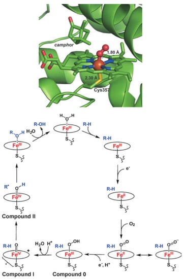 O2 bound to the ferrous heme in the active site of cytochrome P450 (top); the catalytic cycle of cytochrome P450 (bottom). Reprinted with permission from Ref. [9]. Copyright 2014, WILEY-VCH Verlag GmbH.