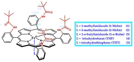 Chemical structures of iron(II) complexes of “picket-fence” porphyrin with substituted axial ligands, [FeII(L)(α,α,α,α-TpivPP)].