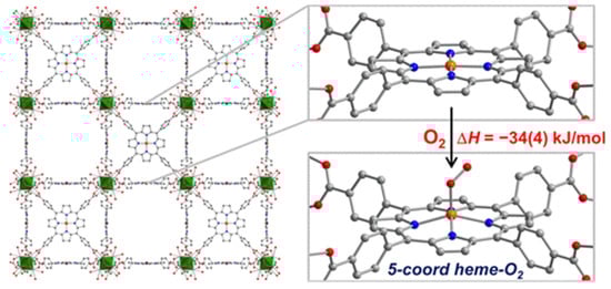 - Anderson, J.S.; Gallagher, A.T.; Mason, J.A.; Harris, T.D. A Five-Coordinate Heme Dioxygen Adduct Isolated within a Metal–Organic Framework. J. Am. Chem. Soc. 2014, 136, 16489–16492. [Google Scholar] [CrossRef] [PubMed]