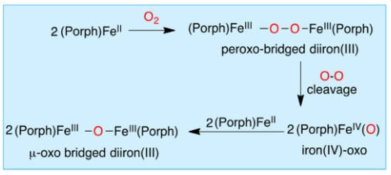 Biomimetic synthetic iron porphyrin complexes, which have the same core structure as the heme cofactor, are perfect models to study the O2 activation. However, a major hurdle presents in simple iron (II) porphyrin complexes, which are facile to undergo bimolecular condensation to form μ-oxo-bridged diiron (III) complexes upon reacting with O2 [13]. The single-atom bridged binuclear complexes have been considered as catalytically inert for a long time. However, Sorokin’s group synthesized and spectroscopically characterized a variety of μ-oxo-bridged and μ-nitrido-bridged complexes, which provided superior catalytic properties [65,66,67]. For example, employing μ-nitrido-bridged diiron meso-tetraphenylporphyrin [(TPP)FeIII(μ-N)FeIV(TPP)], they prepared a highly reactive intermediate, Fe(IV)(μ-N)Fe(IV)(=O) tetraphenylporphyrin cation radical species, which exhibited a very high activity for C–H activation towards alkanes, even including the strongest C–H bond of methane [65]. Until the 1980s, the mechanism for the bimolecular condensation was fully described as shown in Scheme 1 [68], in which the autoxidation proceeds via a peroxo-bridged diiron(III) and the FeIV(O) intermediates [68,69,70,71,72]. Encouragingly, this hurdle has been partially overcome through introduction of sterically hindered substituents onto porphyrin scaffolds, which prevent bimolecular condensation reactions and enable isolation and thorough characterization of heme-O2 adducts [73,74,75,76,77,78,79,80].