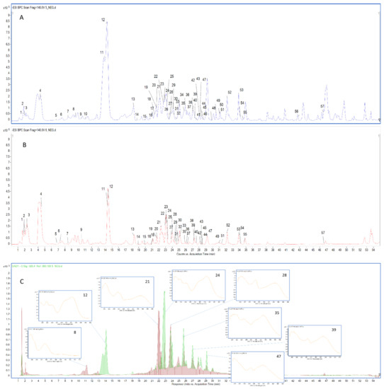 In terms of flavones, four compounds were identified in the leaf methanolic and infusion extracts. By comparing their retention time and fragmentation behaviour with the available literature data, compound 54 was assigned as apigenin; 51 as luteolin; compound 29, eluted in 23.924 min, as luteolin-O-hexoside; and compound 55 as tetrahydroxyflavone, due to insufficient data [38,39,40].