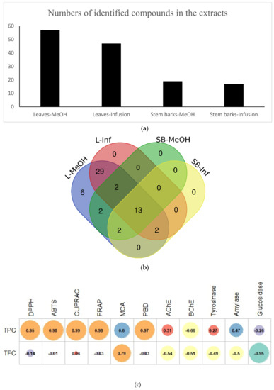 (a) Number of identified compounds in the extracts. (b) Venn diagram showing the number of common compounds found in the tested extracts. L-MeOH—leaves-MeOH; L-Inf—leaves-infusion; SB-MeOH—stem bark-MeOH; SB-Inf—stem bark-infusion. (c) Pearson’s correlation between total bioactive components and antioxidant and enzyme inhibitory effects.