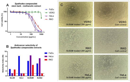 The influence of S. campanulata extracts on normal and cancer cells: (A)—dose–response curves of ScSbM in normal and cancer cells; (B)—comparison of selectivity indexes obtained for S. campanulata extracts; (C)—influence of ScSbM 250 µg/mL on VERO, RKO, and HeLa cells (magnification × 100).