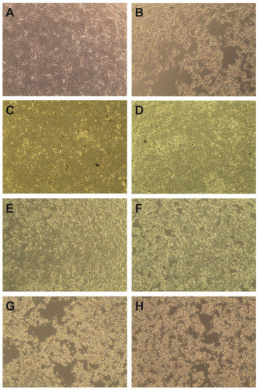 Influence of S. campanulata on the HHV-1-induced cytopathic effect (magnification × 100). (A)—VERO cell control; (B)—HHV-1 induced cytopathic effect (CPE) in infected VERO cells; HHV-1 infected VERO cells treated with ScLM 500 µg/mL (C), ScLM 250 µg/mL (D), ScSbM 500 µg/mL (E), ScSbM 250 µg/mL (F), ScLI 125 µg/mL (G), or ScSbI 125 µg/mL (H).