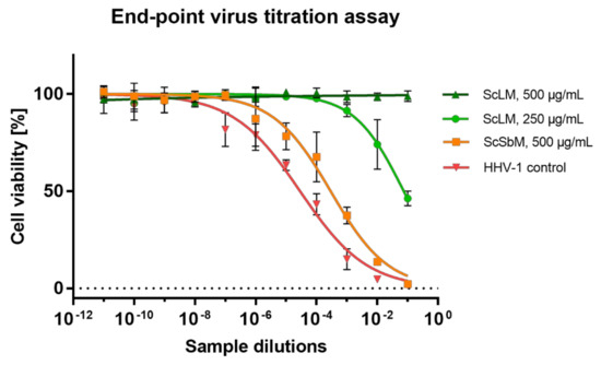 To further evaluate the anti-HHV-1 activity of S. campanulata, the collected samples were subjected to an endpoint dilution assay to measure the HHV-1 infectious titre. The reduction in the HHV-1 infectious titre (Δlog) in comparison to the VC is presented in Table 4. During all endpoint titrations performed, the infectious titre of HHV-1 in the samples treated with ScLM 500 µg/mL could not be measured (an example of the titration assay is shown in Figure 6); taking into account the mean HHV-1 infectious titre in the VC, the mean inhibition was 5.11 log (Table 4). On the other hand, at a concentration of 250 µg/mL, ScLM reduced the viral infectious titre by 4.22 log. Since a reduction in viral infectious titre by at least 3 log is required for significant antiviral activity, ScLM can be regarded as having such activity. Among the rest of the S. campanulata extracts, only ScSbM showed inhibition higher than 1 log; however, this was not high enough to be considered significant. Acyclovir, used as a model antiviral drug, not only inhibited the development of the CPE but also abolished the infectivity of HHV-1 (Δlog > 5).