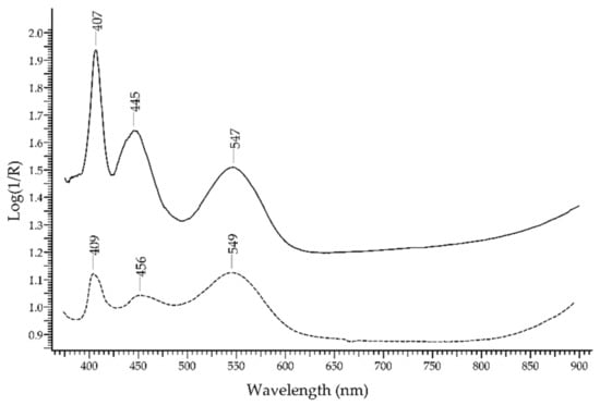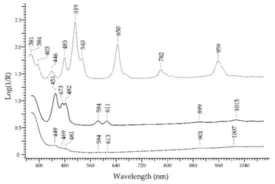 - Aceto, M.; Agostino, A.; Fenoglio, G.; Idone, A.; Gulmini, M.; Picollo, M.; Ricciardi, P.; Delaney, J.K. Characterisation of Colourants on Illuminated Manuscripts by Portable Fibre Optic UV-Visible-NIR Reflectance Spectrophotometry. Anal. Methods 2014, 6, 1488. [Google Scholar] [CrossRef]