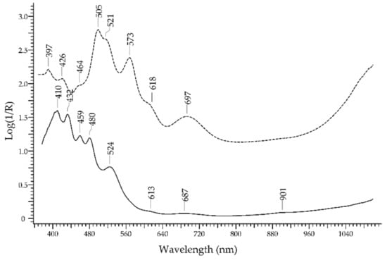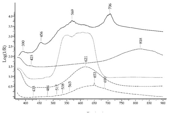 - Manning, P.G. The Optical Absorption Spectra of the Garnets; Almandine-Pyrope, Pyrope and Spessartine and Some Structural Interpretations of Mineralogical Significance. Can. Mineral. 1967, 9, 237–251. [Google Scholar]