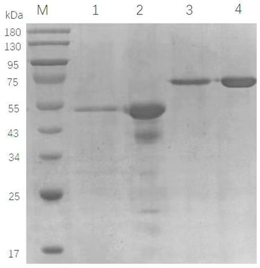SDS-PAGE results of the purified TvChi1 and CmChi1. Lanes 1–4 are purified TvChi1, crude enzyme solution of TvChi1, purified CmChi1, and crude enzyme solution of CmChi1, respectively.