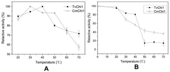 Effect of temperature on activities of the TvChi1 and CmChi1. (A) The optimal temperature for TvChi1 and CmChi1; (B) the temperature stability for TvChi1 and CmChi1. Data are given as means ± standard deviation, n = 3.