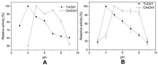 Effect of pH on activity of the TvChi1 and CmChi1. (A) The optimal pH for TvChi1 and CmChi1; (B) the pH stability for TvChi1 and CmChi1. Data are given as means ± standard deviation, n = 3.