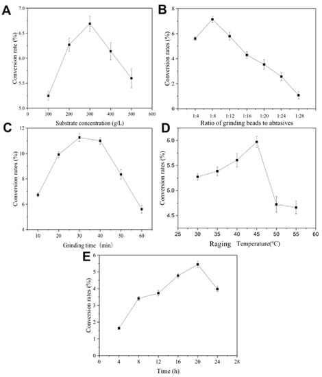 Optimizations of liquid-assisted grinding (LAG) and Raging for GlcNAc production. (A) Substrate concentration; (B) ratio of beads to abrasives; (C) grinding time; (D) raging temperature; (E) reaction time. Data are given as means ± standard deviation, n = 3. The conditions: (A) beads 80 g, chitinase 5 g, 10 mL sodium acetate buffer with pH 5.5, 451 rpm grinding for 30 min, and Raging at 53 °C for 12 h, and different concentrations of chitin powder were set; (B) chitin powder 5 g, chitinase 5 g, and 10 mL sodium acetate buffer with pH 5.5, 451 rpm grinding for 30 min, and Raging at 53 °C for 12 h, different concentrations of beads were set; (C) chitin powder 5 g, chitinase 5 g, 10 mL sodium acetate buffer with pH 5.5, beads 80 g, 451 rpm grinding, and Raging at 53 °C for 12 h, and different grinding times were set; (D) chitin powder 5 g, chitinase 5 g, 10 mL sodium acetate buffer with pH 5.5, beads 80 g, 451 rpm grinding for 30 min, and Raging for 12 h, and different Raging temperatures were set; (E) chitin powder 5 g, chitinase 5 g, 10 mL sodium acetate buffer with pH 5.5, beads 80 g, 451 rpm grinding for 30 min, and Raging at 53 °C, and different Raging times were set.