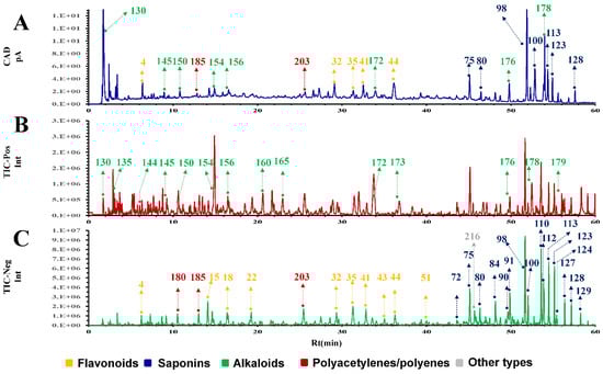 The enriched part of the SPE column was mainly composed of polyacetylenes, flavonoids, and saponins. It was challenging to profile these components sensitively and simultaneously in a single chromatogram. Due to the prominent advantage of the sensitivity of the CAD as a universal detector, it was adopted to construct the chromatographic fingerprint of secondary metabolites in the SFI (Figure 1A). The chromatographic system was optimized comprehensively, including different columns, mobile system, mobile gradient, flow rate, column temperature, and injection volume. The CAD parameters were also compared one by one. The method validation was evaluated based on precision obtained on different columns, instruments, and labs (data not shown).