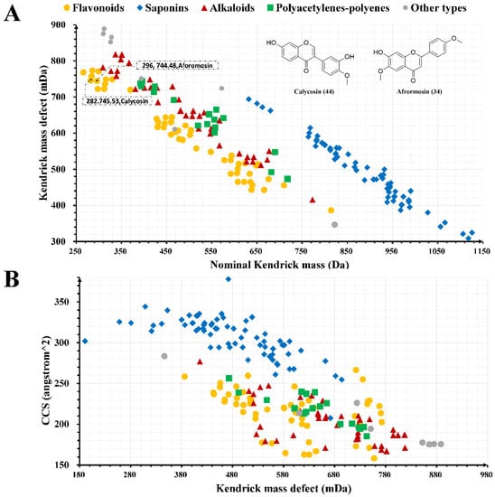 When comparing the CCS values acquired by UPLC-IMS-Q-TOF analysis with the CCS values retrieved from the literature [18], the CCS values of the same components characterized in the current study were consistent with previous literature within 1% variation. This indicated that the CCS values obtained in the current study are accurate and can be applied to future analysis. The KMD method and the CCS values were integrated to analyze the characterized components and the results are shown in Figure 2B. Figure 2B shows that the higher the molecular weight of the identified compound, the larger the CCS value. Additionally, the CCS values of the saponins were larger than those of other types of components. These data contribute to establishing a CCS database of characterized compounds which can provide a reference for identifying chemical components in the SFI.