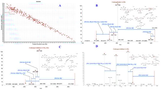 The KMDF scatter plot depicted the m/z values of potential alkaloids in SFI after PMDF treatment in Shenqi Fuzheng Injection (SFI) and the MS/MS spectra of the representative alkaloids and possible MS fracture patterns. ((A), KMDF scatter plot of potential alkaloids; (B), codonopiloside A; (C), codonopiloside A + CH2; (D), codonopyrrolidium A).