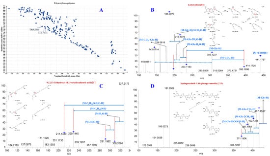 The KMDF scatter plot depicted the m/z values of potential polyenes and polynephthenes in Shenqi Fuzheng Injection (SFI), the MS/MS spectra of the representative polyene and polycynes, and the possible MS fracture patterns. ((A), KMDF scatter plot of potential polyene and polycynes; (B), lobetyolin; (C), 9,12,13-Trihydroxy-10-octadecadienoic acid; (D), syringaresinol 4′-O-glucopyranoside).
