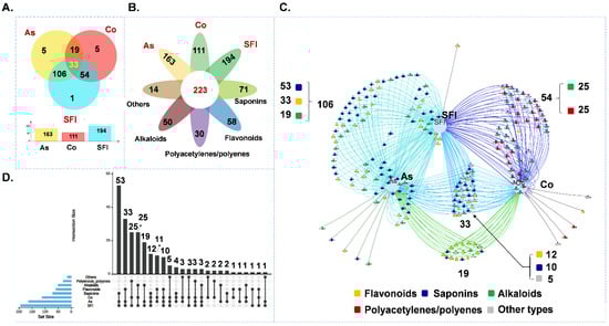 Various analyses show the source plants and composition of chemical components in Shenqi Fuzheng Injection (SFI). ((A), Venn diagram of the characterized components in SFI; (B), flower plot of the characterized chemical compositions in SFI; (C), Venn network of chemical constituents in SFI; (D), UpSet plot of chemical constituents in SFI).