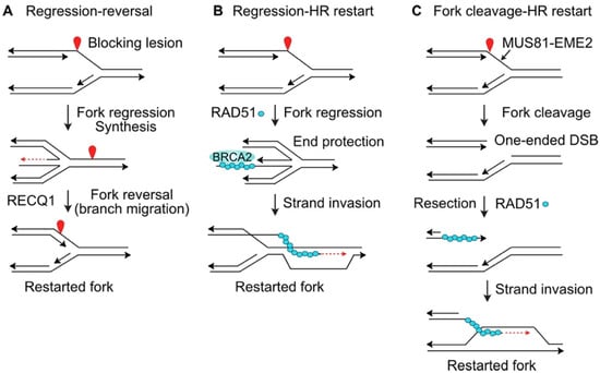 Stalled replication forks may also be restarted by at least three mechanisms that involve fork regression or fork cleavage. A blocked fork may regress, creating a 4-strand branched structure that resembles a Holliday junction, and this allows the blocked strand to anneal to the nascent strand of the sister chromatid, and prime synthesis using the nascent strand as a template (Figure 2A). If this synthesis extends far enough, the regressed fork can reverse in a reaction catalyzed by RECQ1 [83], reestablishing a functional replication fork, and bypassing the blocking lesion (Figure 2A). Regression of a stalled fork also produces a structure with a one-ended DSB that is prone to attack by nucleases. Cells protect these ends with two key HR proteins, RAD51 and BRCA2 (Figure 2B), along with a host of other factors including RIF1, FANCA, FANCC, FANCD2, FANCG, ABRO1, VHL, RADX, and BOD1L [97,98,99]. There are at least two distinct fork regression mechanisms, one promoted by HLTF, SMARCAL1 and ZRANB3, and another by FBH1; 53BP1 is a fork protection factor for FBH1-remodeled forks [97]. The RAD51 filament in the protected regressed fork can catalyze strand invasion to reestablish a functional replication fork (Figure 2B). A third class of fork restart pathway involves cleavage of the stalled fork by branched structure-selective nucleases MUS81 (with its EME2 cofactor) or EEPD1 [100,101,102,103,104] (Figure 2C). Cleavage of a stalled fork creates a one-ended DSB that poses a significant risk of large-scale genome rearrangement if cNHEJ mediates rejoining with another DSB elsewhere in the genome (i.e., at another broken fork or one of the ends at a frank, two-ended DSB). To avoid genome destabilization by cNHEJ-mediated mis-repair of the one-ended DSBs at cleaved forks, the EEPD1 pathway includes an important safeguard. EEPD1 interacts with and promotes EXO1-mediated end-resection of the one-ended DSB to inhibit cNHEJ and promote accurate fork repair and restart by HR [21,102]. An analogous system to promote the resection of one-ended DSBs induced by MUS81-EME2 has yet to be described. MUS81 is a 3′ nuclease first identified in Saccharomyces cerevisiae [105] and this forces invasion of the one-ended DSB into the discontinuous lagging strand duplex. In contrast, the 5′ nuclease EEPD1 evolved more recently in chordates/vertebrates, and this mode of cleavage allows invasion by the resected end into the continuous, leading strand duplex. The EEPD1 cleavage mechanism may speed fork restart and thereby reduce the opportunity for stressed forks to assume toxic structures, promoting both genome stability and cell survival under stress [43].