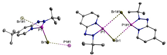 The single-crystal XRD studies revealed that crystals of all P–Br/I-substituted TAPs studied comprise clearly identifiable molecular units (see Figure 1). The carbon and nitrogen atoms in the fused heterocycles are generally arranged in a common plane. The phosphorus atoms in 2c,e,f, and 3a are slightly (by 0.13–0.23 Å) dislocated out of this plane, and the five-membered rings adopt thus a flat envelope conformation in which the P–Br bond assumes the flagpole position. In the case of 2d, the phosphorus atom is located in the same plane as the carbon and nitrogen atoms, and the five-membered ring is planar. The six-membered rings stay planar in all compounds. Each phosphorus atom in 2a–f further exhibits a single intermolecular contact with the bromine atom of a neighboring molecule, which is for 2c–e below the sum of van-der-Waals radii (3.76 Å [17]). These Br⋯P interactions connect individual molecules to supramolecular aggregates in the form of one-dimensional infinite stacks (2c,e) or discrete dimeric units (2d,f), respectively (Figure 1).