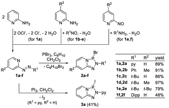 Recently, the range of unsymmetrically substituted TAPs was extended by the synthesis of pyrido-annellated derivatives (2,3-dihydro-[1,2,4,3] triazaphospholo [4,5-a] pyridines) via base-induced condensation of hydrazo-bis-pyridine with PCl3 or (Et2N)2PCl, respectively (Scheme 1b) [9]. Although post-modification via formal exchange of a P-amino-substituent for halides was feasible, the scope of this approach is still limited by the synthesis of target molecules carrying a 2-pyridin-2-yl substituent. Moreover, the one-step preparation of the synthetically valuable P-chloro-derivative is hampered by its low solubility in common organic solvents as well as difficulties in its separation from hydrochloride salts formed as by-products.
