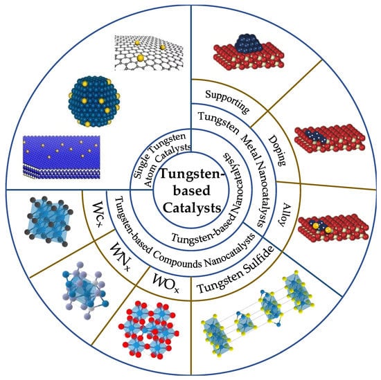 19], the direction and content of tungsten-based catalysts have been extended. These include tungsten monomers and tungsten compounds. In this paper, the single atom catalysts, tungsten metal nanocatalysts and tungsten-based compounds nanocatalysts are comprehensively reviewed and expanded in detail (