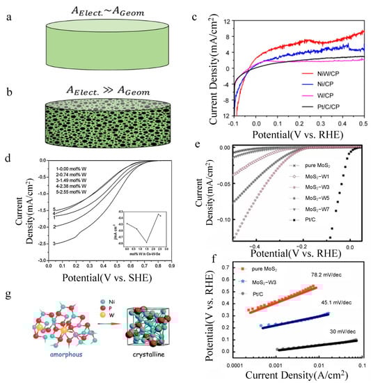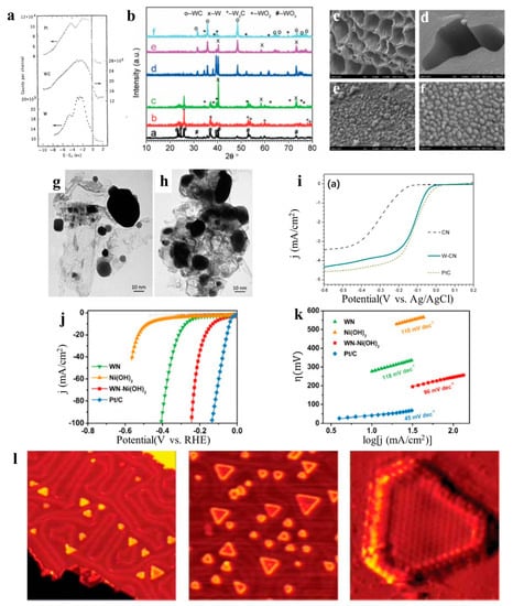 15] found that the catalytic performance of a tungsten-based catalyst is close to that of a Pt-based catalyst through electrochemical analysis. It was found that when W is loaded onto the carrier material, the band gap of the semiconductor will narrow, providing a large number of active sites, further improving the catalytic activity and stability. Meanwhile, Tu et al. [